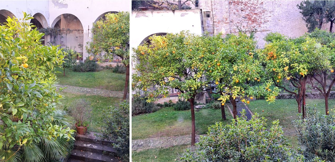 Uno dei gioielli del sito è il suo giardino storico, un tempo orto conventuale, restaurato negli anni ‘90 per riportarlo alla sua configurazione cinquecentesca. Il giardino presenta un elegante agrumeto centrale, vialetti in acciottolato ligure e una vegetazione che continua a essere valorizzata grazie a interventi di riqualificazione.